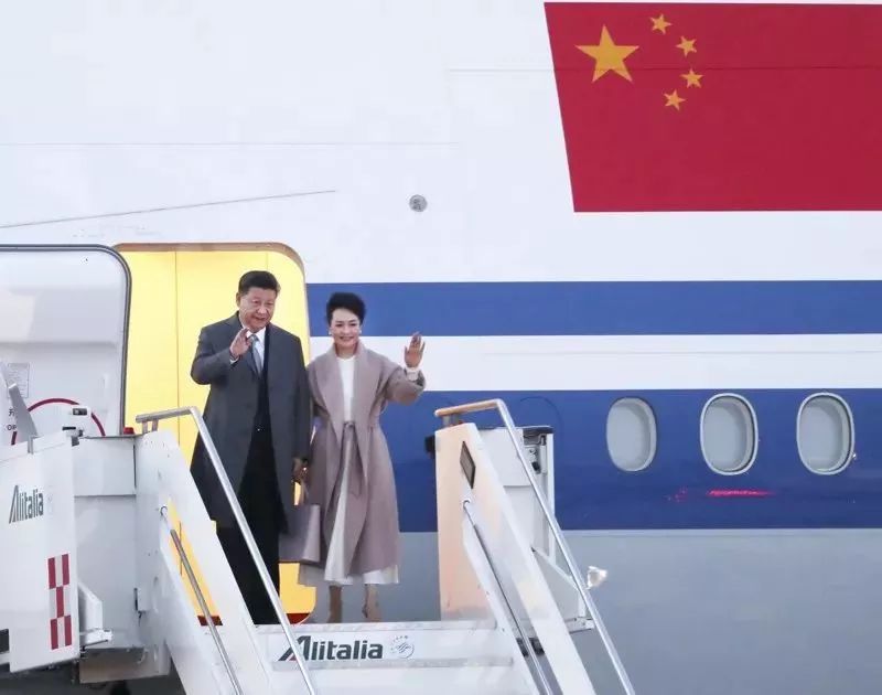 △21日,习近平主席乘专机抵达罗马,开始对意大利共和国进行国事访问。这是习近平主席和夫人彭丽媛步出舱门。